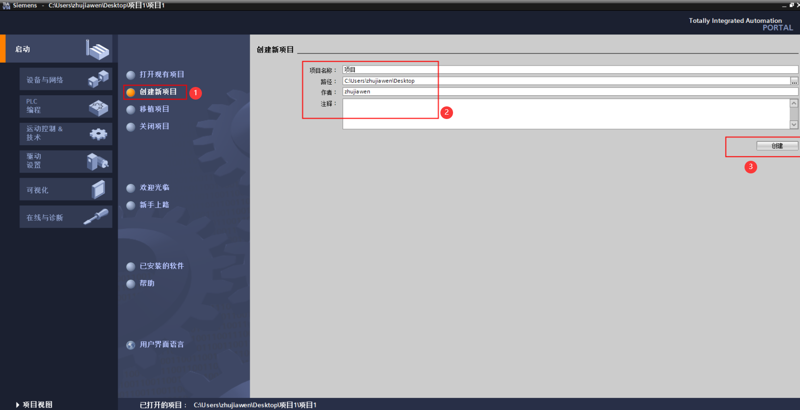 新建工程打開 TIA Portal 軟件,選擇“創(chuàng)建新項目”,并填寫項目名稱、路徑、版本、作者等相關(guān)信息,點擊創(chuàng)建: