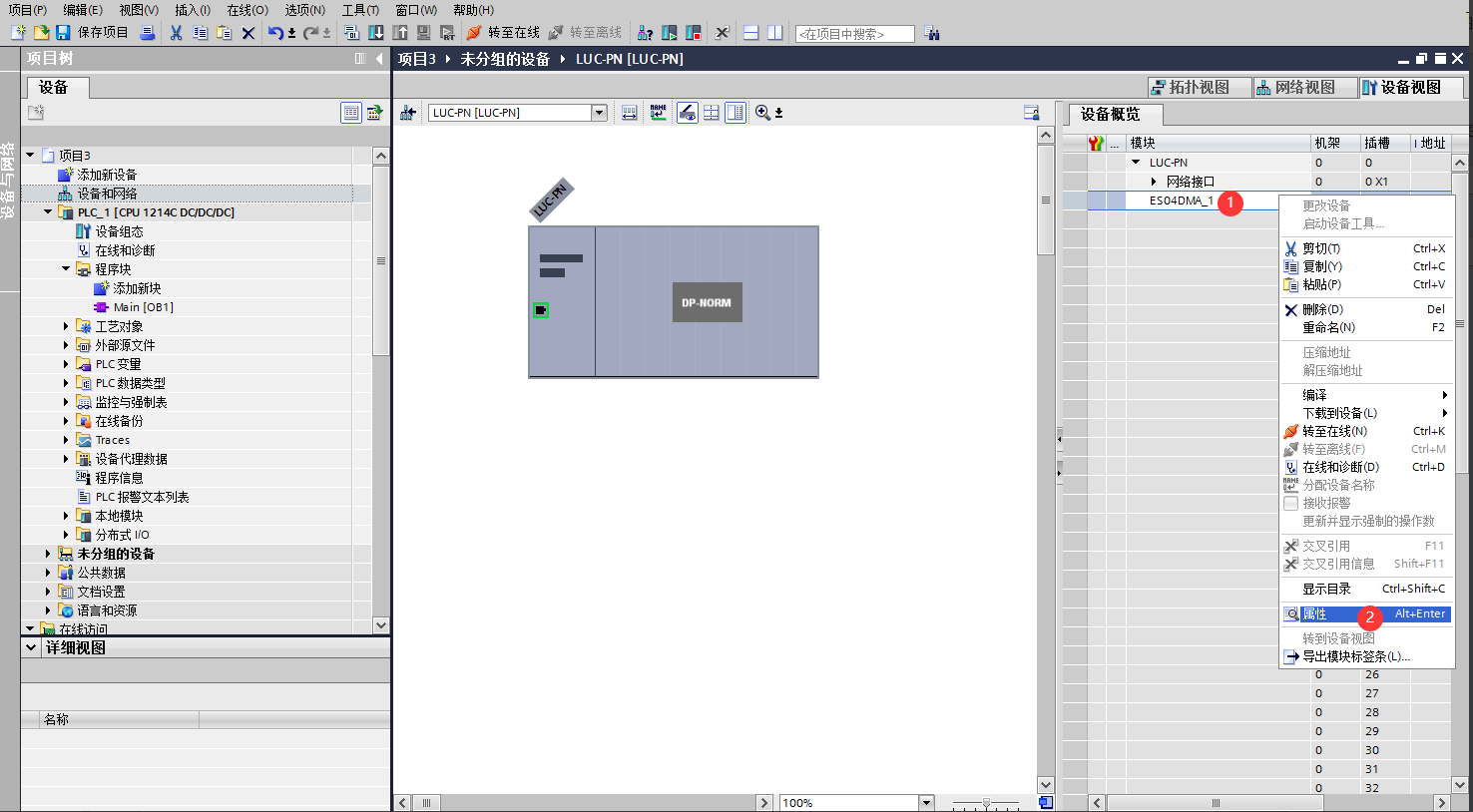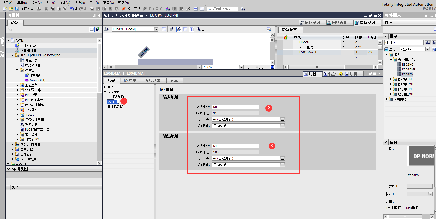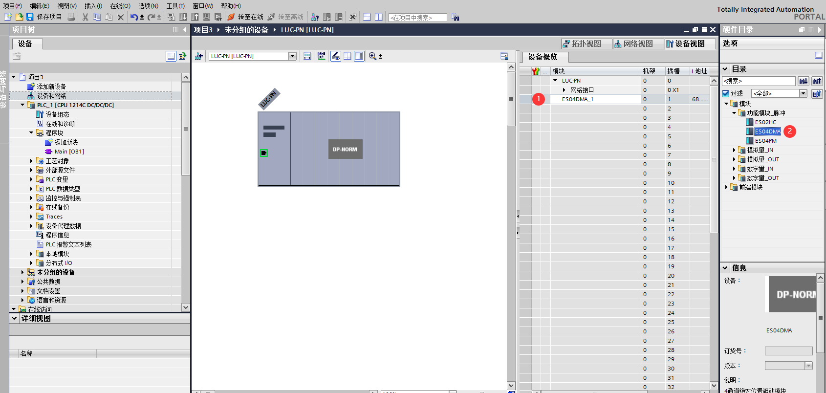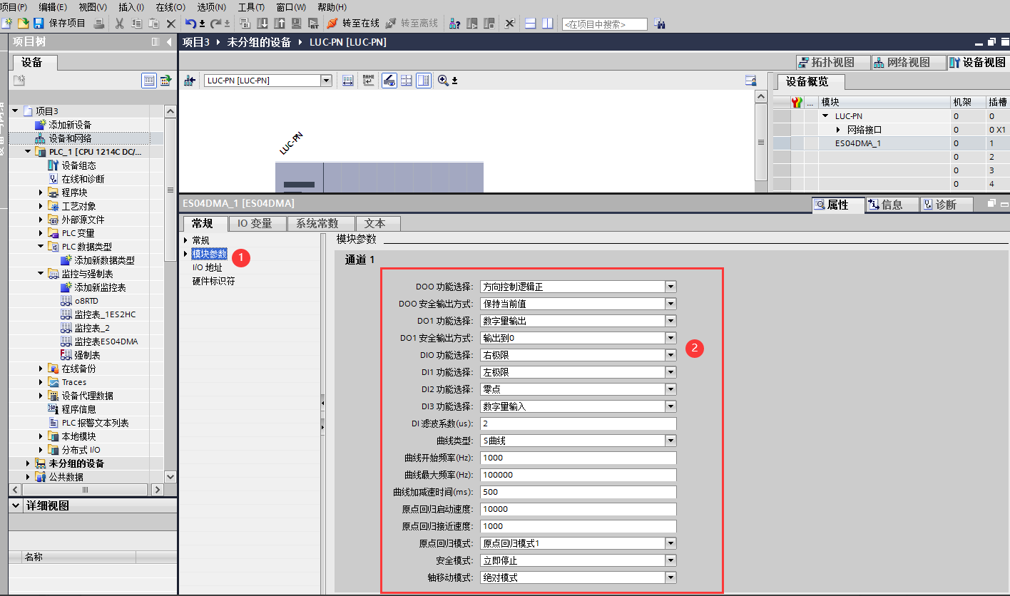 添加ES-04DMA硬件。雙擊后TIA Portal軟件右上角區(qū)域會出現(xiàn)LUC-PN擴(kuò)展模塊的信息。先選中插槽1,再選擇“功能模塊_脈沖”再雙擊ES04DMA。