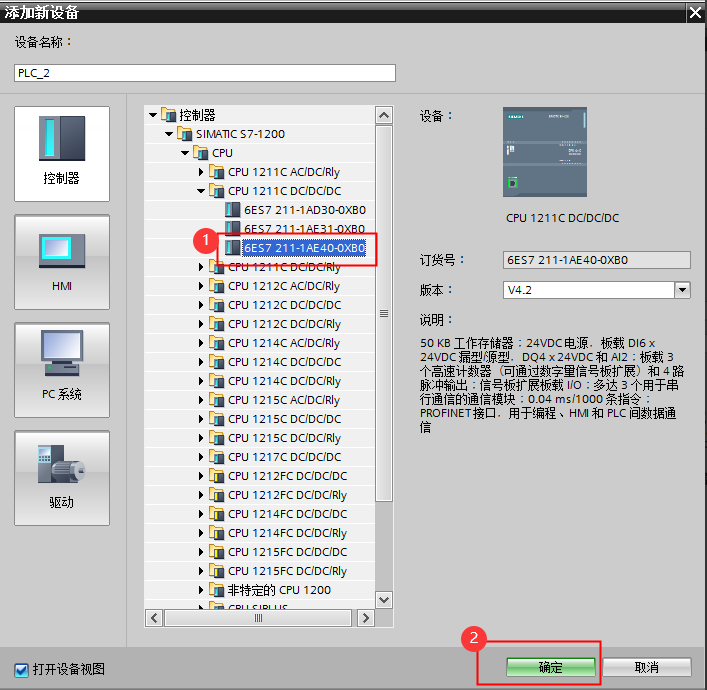 彈出“添加新設(shè)備” 窗口,進(jìn)行“控制器/SIMATIC S7-1200/CPU→CPU 1211C DC/DC/DC→6ES7 211-1AE40-0XB0” 操作,點擊確定: