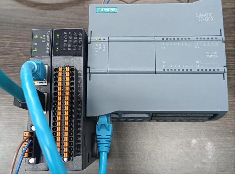 S7-1200PLC與遠(yuǎn)程IO模塊電源,將測試對象PLC的網(wǎng)口, 通過網(wǎng)線插入到遠(yuǎn)程IO模塊的X1口, 后將遠(yuǎn)程IO模塊的X2 口通過網(wǎng)線接入到調(diào)試電腦網(wǎng)口上。