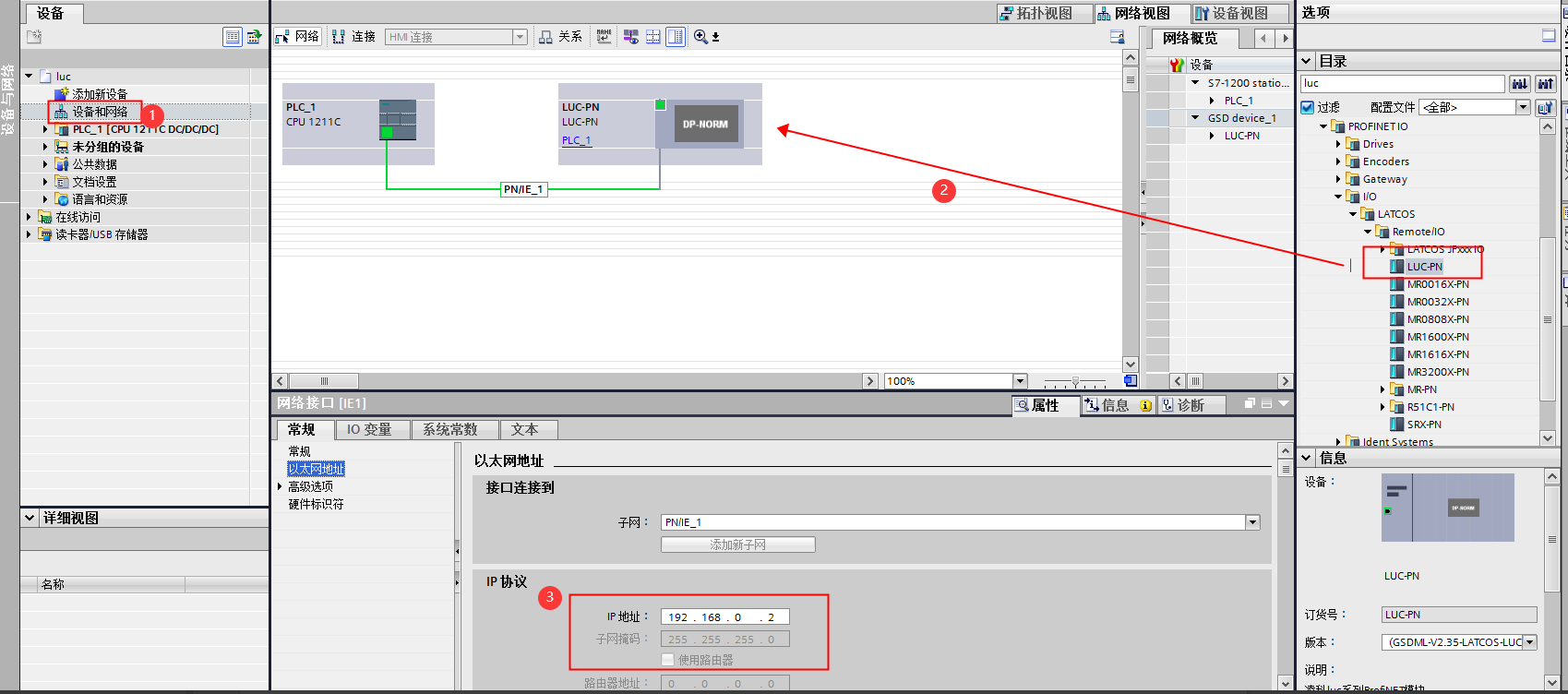 添加LUC-PN模塊。選擇中間界面的“網(wǎng)絡(luò)視圖”,在右側(cè)硬件目錄找到“LUC-PN” 拖拽到左側(cè)網(wǎng)絡(luò)視圖,并設(shè)置IP地址:
