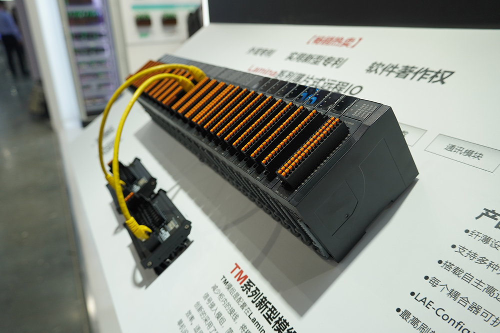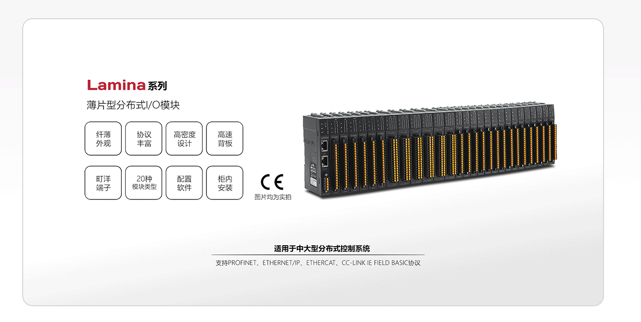 LAMINA系列薄片式遠程I/O,是展示期間最受客戶關注的產品。該系列I/O支持5種PLC總線協議,其中包括PROFINET,EHTERNET/IP,ETHERCAT,CC-LINK IE FB,MODBUS TCP。可支持32個模塊擴展,無需饋電模塊,模塊種類豐富,包含了數字量輸入輸出,模擬量輸入輸出,熱電偶,熱電阻,脈沖輸入、輸出,定位、485/232等多達20多種功能模塊。
