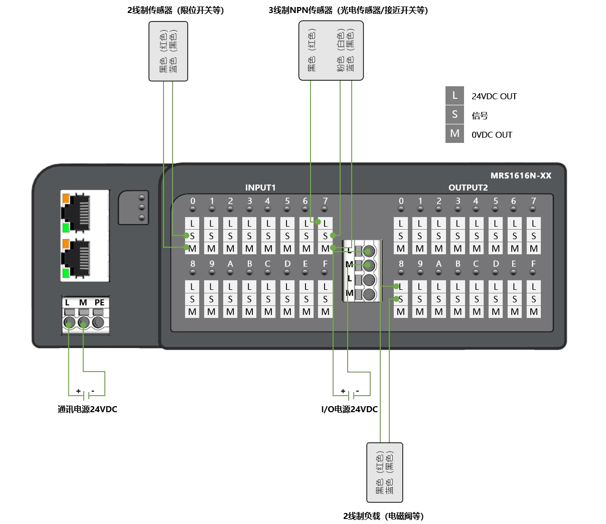 面板式快接線分布式I/O,CC-Link IE FiledBasic通訊,2xRJ45,可級聯;數字量16入16出 NPN,24VDC,0.5A,歐式彈簧端子;導軌安裝&打孔安裝(下單時需備注)