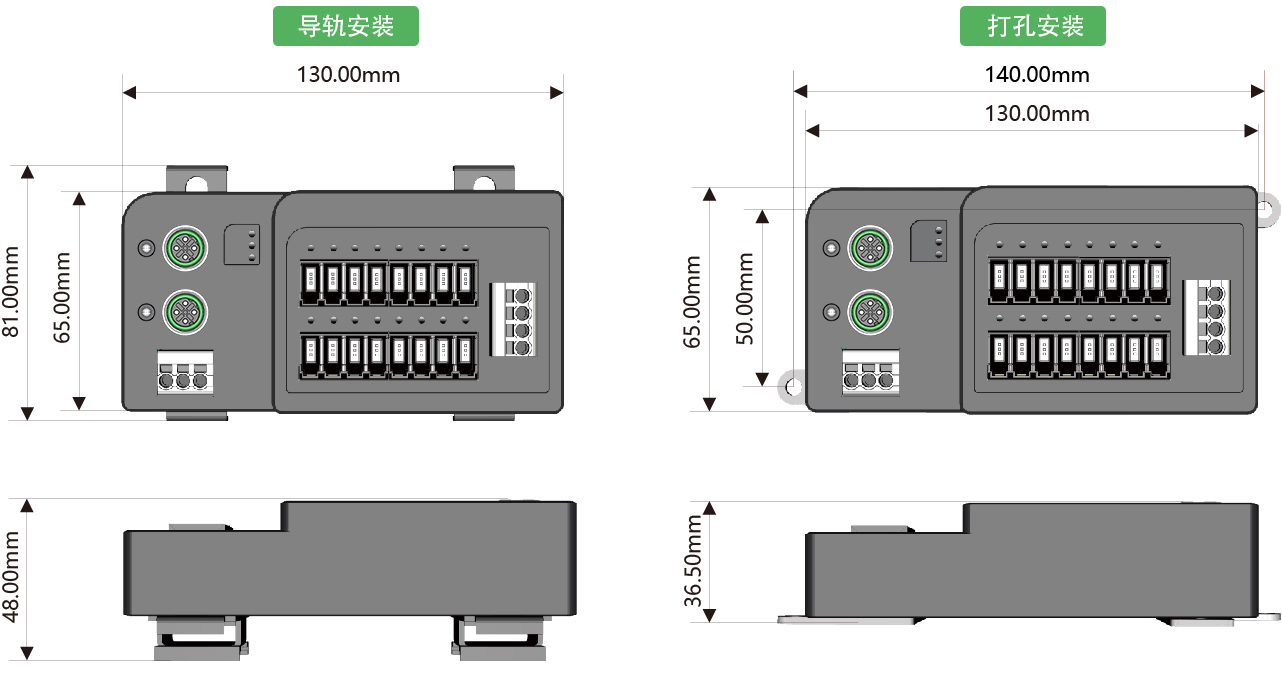 安裝方式:DIN35導軌安裝或雙側耳打孔安裝